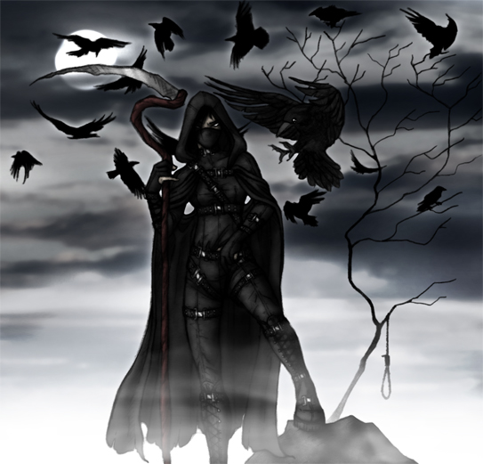The shape of the scythe came into my head from seeing a random pattern on a wall. So I drew the scythe and attached a wielder to it, along with a murder of crows. And a noose for some reason.