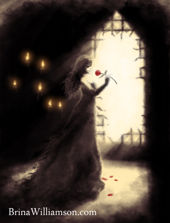 The story behind it is actually kind of funny, because it came into my head from misseeing what a thumbnail image actually was. The image I glimpsed the thumbnail of was nothing like this, it was a kneeling man, with a cityscape behind him, but from the light and shadows it looked to me like a woman in a long tattered dress, standing in front of a broken window.